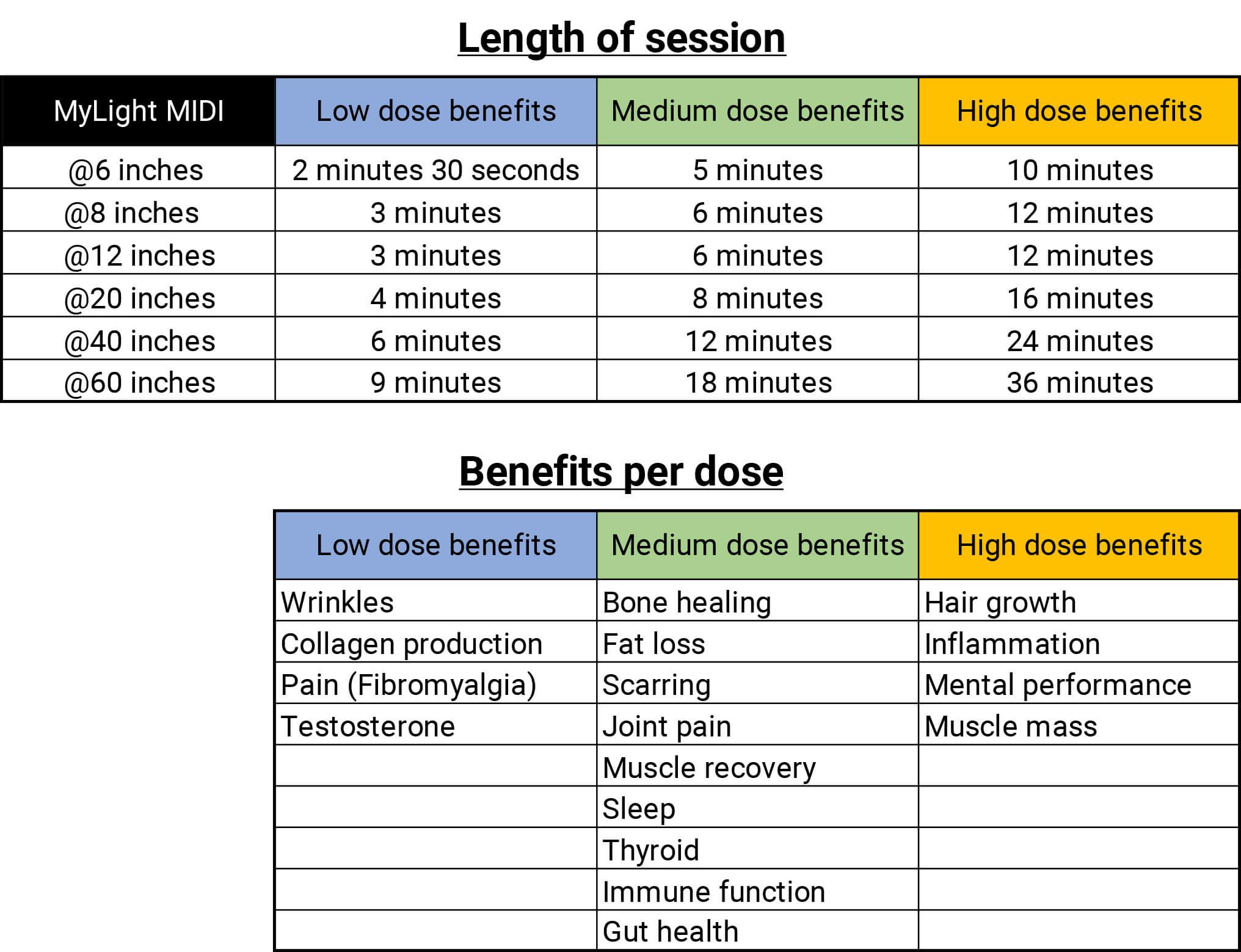 In order to maximize your recovery process, we recommend getting a medium dose of red light therapy. As you can see on the graph below, this can be done in as little as 5-minutes using a MyLight MIDI: